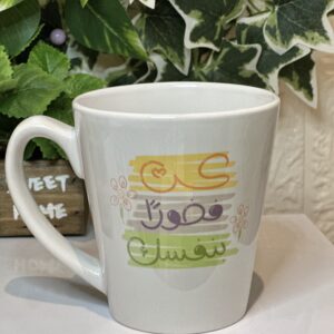 كوب سيراميك حجم صغير مع صحن خشبي خاص به تم تصميم الكوب بناء على ثيم دعوة استقبال بيبي حمد