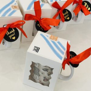 توزيعات بيبي هيا تم اختيار تصميم الكوب بناء على ثيم الدعوه على استقبال الولاده،  وتم اختيار عبارات ايجابيه تحفيزية على