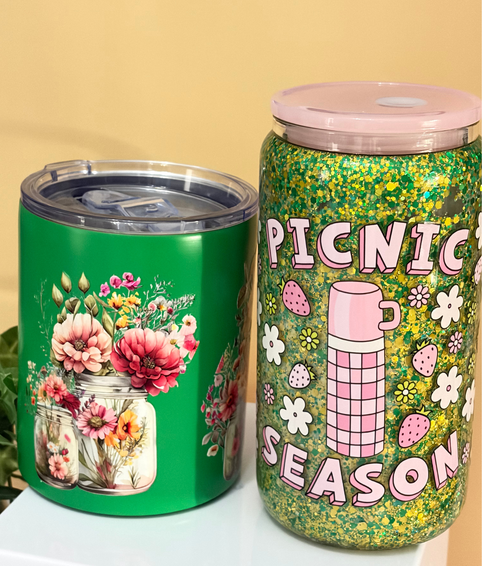 كوب حافظ للحراره والبرودة سعة ١٠ لون اخضر مع كوب زجاجي للمشروبات الباردة